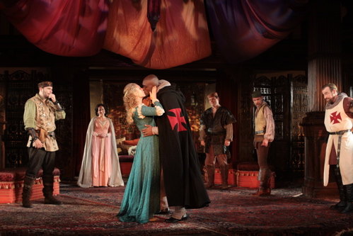 It’s part of the play’s heritage that somehow the namesake character can get overshadowed by his evil second. Othello’s always a difficult role, as the audience is seduced by Iago just as he is – here Odera’s Othello is a seasoned Templar knight, older than his young bride and therefore a little too susceptible to midlife insecurities. Though he plays to the fits and madness a bit too disjointedly, his playful roughhousing of Iago and his early indulgence of Desdemona alerts us that this Othello’s desire to be the best and to be liked while doing it will be the key to his downfall. It also shows us the root of Iago’s hatred of him, as he play-fights too hard, keeping Iago down like a bad dog. This Othello is the brilliant warrior more comfortable in battle, dispensing justice too quickly for the dangerous nuances of peacetime.