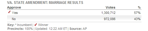 Here’s the tally for yesterday’s Virginia State Marriage Amendment voting that denies civil unions, domestic partnerships and any “other arrangement” between same-sex couples that purports to bestow the benefits of marriage: