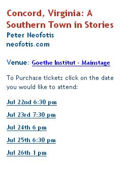 Case in point: Concord, Virginia: A Southern Town in Stories gets (perfectly reasonably) one paragraph on the Fringe site. However you can copy and paste the link to the artist’s website (why, Fringe, why? Was there a shortage of <A> tags?) and get a much longer description of the work. Sometimes, like with Kevin Thornton’s Sex, Dreams and Self Control, the website will even have some recorded video or audio clips to help you make up your mind.