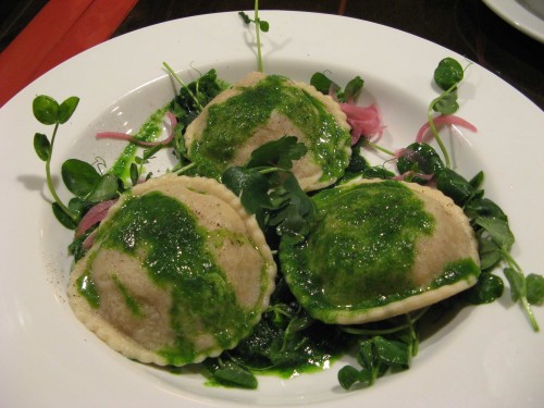 Katie: Some of the menu standouts include the antipasto, a platter of prosciutto, anchovies, feta and pickled veggies, or the panzanella salad with honey crisp apples and organic greens. I’d recommend ordering your pizza off the specials menu – the pizza carbonara is like breakfast for dinner with pancetta, sieved egg and ricotta. The shitake and oyster mushroom ravioli is a pitch-perfect vegetarian dish, served over creamy polenta. Also served with organic beets, the dish would be a great dinner with a side of the brussels sprouts Donna mentioned.