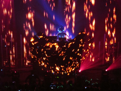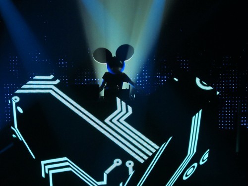 I was not at the Friday night show. I was, however, at the concerts on Wednesday and Thursday night to witness the Deadmau5 techno-spectacle road-show first hand. Since debuting his new stage show at the Coachella Music Festival back in April, Deadmau5 has been touring hard around the world with an incredible show that blends electronic music and digital visuals better than almost anything else I have seen.** His aggressive campaign to take the crown for best electro-concert experience has been relentless and I’m afraid has now taken its physical toll on him. With each show, Deadmau5 makes his case for best dance concert experience with an astonishing display of visual fireworks that envelopes and overwhelms you while his bass-heavy House/Electro beats toy with you like a sadistic cat would a dead mouse. For fans of performance spectacle, the tour is a visual feast. For dance music fans, Deadmau5′ current tour is about as close to nirvana as it gets.