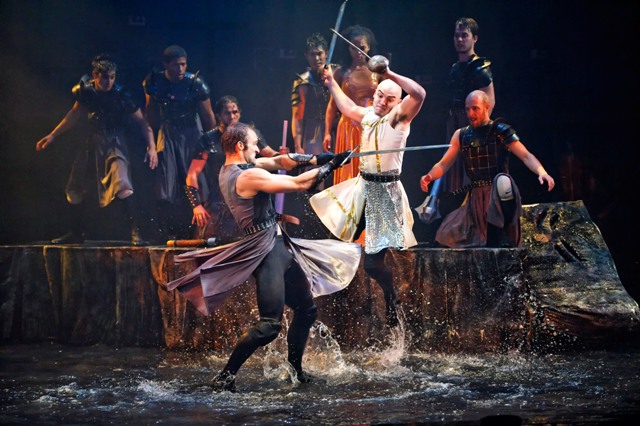 Ben Cunis as King Arthur, Vato Tsikurishvili as Lancelot, and Ensemble in Synetic Theater’s “King Arthur.” Photo credit: Graeme B. Shaw