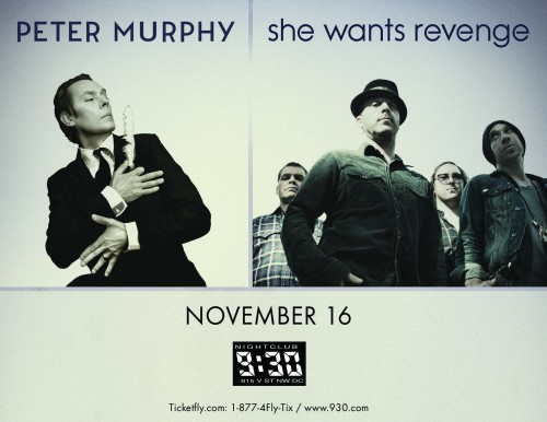 This week we are giving away a pair of tickets to see Peter Murphy & She Wants Revenge at the 9:30 Club on November 16th. Tickets for this concert are available on Ticketfly or at the 9:30 Club box office.