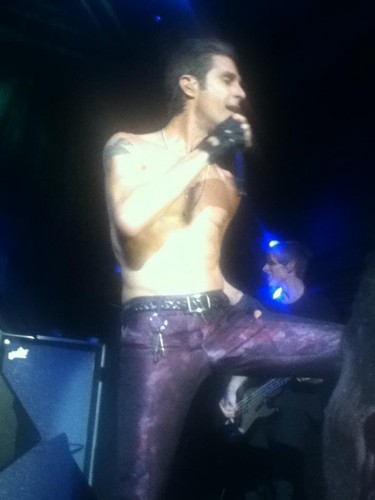 Jane’s Addiction took the stage around 10:30, to an ecstatically cheering audience. Though the band grew to fame as vanguards of the “alternative” rock scene, they seemed to embody LA glam rock, at least visually, on Friday night. Frontman Perry Farrell wore skintight purple leather pants (or vinyl, hard to tell…) and he and pretty-boy guitarist Dave Navarro were quickly shirtless, showing off their fit physiques (and Navarro’s impressive tattoo collection). To complete their glam rock extravaganza, as they broke into their opening song, “Underground”, Farrell’s wife (Etty Lau, who Farrell met when she was a dancer for the band on tour in 1997) climbed onto a big platform at the back corner of the stage, wearing underwear and “danced” (read wiggled, posed & gyrated) while they played. I found that element of the show (she left but came back out later, with another woman dancer for a couple other numbers) to be super-cheesy, and unnecessary.