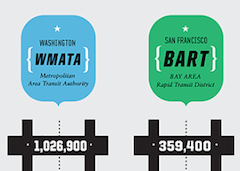 Like porn, though, I’m not sure if the graphic is representative of reality: how are there really 1M riders on Metrorail + Metrobus on an average day, when an average day has 1.2M trips (not riders) between the two systems and likely a total passenger total of much less than half that number. But hey, we’re probably still ahead of Boston and SF. That counts for something, right?