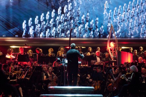 I have been to my fair share of film music concerts, but I must say that I have never attended one that began with the THX test-tone blasting at full volume, followed by the 20th Century Fox theme performed by a live orchestra. This was a thrilling way to start things off and just as the goosebumps were settling, the orchestra launched into the Star Wars title theme and a medley to get the ball rolling. Rising from behind the impressively-sized orchestra, a massive three-story-tall, high-definition screen dominated the floor of the Verizon center and on it re-edited montages of footage from all six Star Wars films played along with the music. The combination of the iconic imagery on-screen, the beautifully lit orchestra and choir, and Williams bombastic music was truly breath-taking.