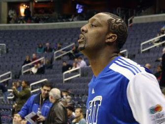 Sporting his crazy new ‘do he warmed up today all smiles. He laughed with players and in a moment of playfulness gave his basketball to a girl on the sidelines and asked her to inbound it back to him. The energy appeared to be infectious amongst the team as the Wizards trounced all over the New Jersey Nets 97-77.