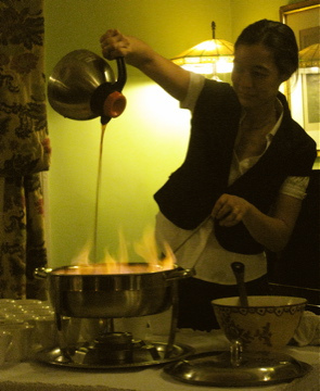The evening ended with Chantal laddling out some Cafe Brulot, the famous New Orleans coffee drink with a flaming twist. This version featured chicory coffee, Remy Martin 1738 cognac, Cointreau Noir, orange peels studded with cloves and a cinnamon stick. This was the way to end my day. I loved the bitter kick of chicory in the coffee and of course who doesn’t love drinks with pyrotechnics! Adam stood valiantly by with a fire extinguisher as Chantal lit long curls of orange peels on fire.