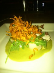 Another great appetizer is the Seared Scallops. The carrot chips on top are delicious, but the presentation is ruined a bit by having them right on top of the scallops, thereby hiding the star of the dish. But the scallops have a killer gritty flavor. I’m definitely not a fan of the Pan roasted Atlantic Calamari; it is just too tough and chewy.