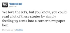 The tweet from @postlocal, the Washington Post’s local desk, itself is simple: “We love the RTs, but you know, you could read a lot of these stories by simply feeding 75 cents into a corner newspaper box.”