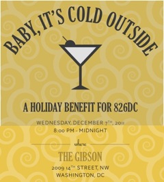 Our friends at 826DC wanted to make sure you were all aware that tickets for their holiday benefit, Baby It’s Cold Outside, are on limited pre-sale at a discount, $50 instead of $60 tomorrow, and $75 at the door, for their December party. Yes, it’s early to be planning for the holidays, but for such a great cause, how could you not? Plus, it says that “Beer, Wine and a specialty cocktail [are] included.” The literacy programs at 826DC are amazing, and they could use your help. Plus, you could use a fancy drink at The Gibson.