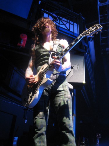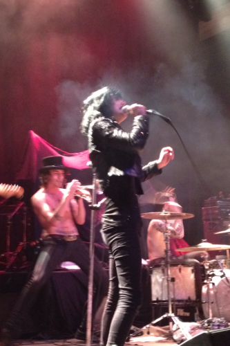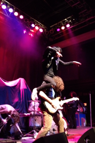 Now it bears mentioning that I have kind of seen Foxy Shazam once before- they were openers at the god-awful trainwreck of a Hole show in 2010, but my mind has blurred that night out, in I think some kind of mild post-traumatic-stress thing. I guess their set was less memorable then, but believe me, Wednesday night was a different story. They were over-the-top energetic, raunchy, and awesome all at once. Singer Nally seemed part-acrobat- turning somersaults, cartwheels, sometimes perched atop his trumpeter’s knee, and even catapulted onto the shoulders of their guitarist during one song, gyrating and shooting invisible arrows from his invisible bow into the audience.