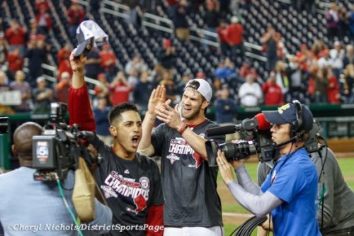 The post-game festivities were a whirlwind of moments strung together as if it were a vertigo haze. Zimmerman and Bryce Harper were caught bear hugging on the field before taking a few pictures with Harper’s pop. Steve Lombardozzi strolled by his teammates carrying around a bottle of champagne with nothing but a satisfied grin occupying his face.
