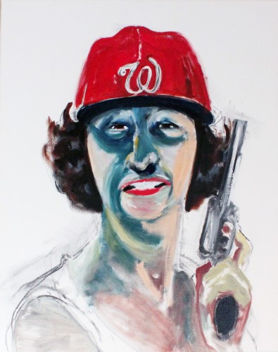 According to Elkins, the paintings take conservative gun rights laws to their “darkly humorous conclusion: that you’d have to carry a gun wherever you go.” Perhaps that’s why the absurdist Self As Lady Bird with Nats Cap feels true to DC and everyday life. As Elkins sees it, guns are taking over our society in an increasingly intimate way. They could eventually “invade the most ordinary and supposedly pleasurable parts of life.”