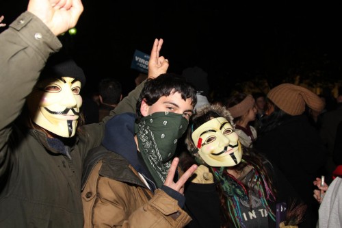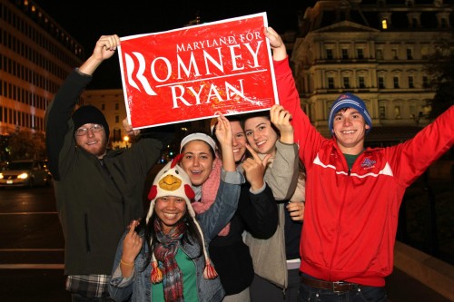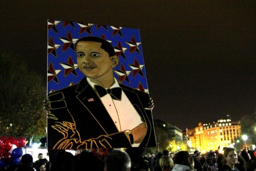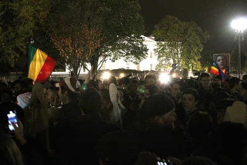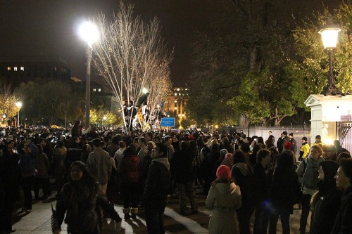 Whenever something big happens politically, locals always have an urge to flock to The White House. Even though President Obama was in Chicago to celebrate his victory over Mitt Romney in last night’s Presidential Election, people from all over decided that the best place for them to celebrate was at 1600 Pennsylvania Avenue. Sure other neighborhoods celebrated with dancing and fireworks, but there’s nothing like reveling in front of the home of the President. When Obama clinched the Electoral College I grabbed my camera and drove down to see the crowds and they did not disappoint. Most of them were young, probably intoxicated college students who held up signs and climbed trees. Phones were out either for calling loved ones, taking photos, or checking in on Foursquare. Over 200 people were checked-in at The White House when I checked-in.