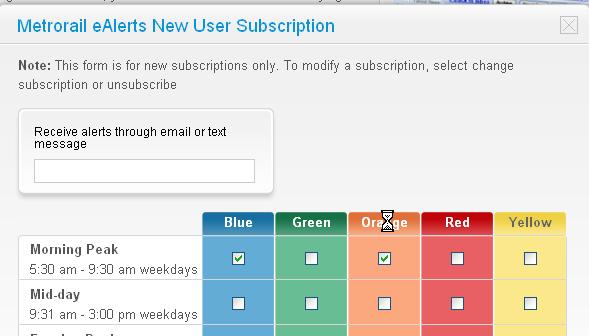One of our loyal readers sent us a note about WMATA’s eAlerts system and the inability to sign up to get them via text messages rather than email. In fairness to WMATA, the main screen only says “you can receive alerts via email notifying you of Metro service disruptions.” However when you click on the subscribe button you get a popup that says “Receive alerts through email or text message” and the box to enter your contact info says “Enter Your email or SMS address.”